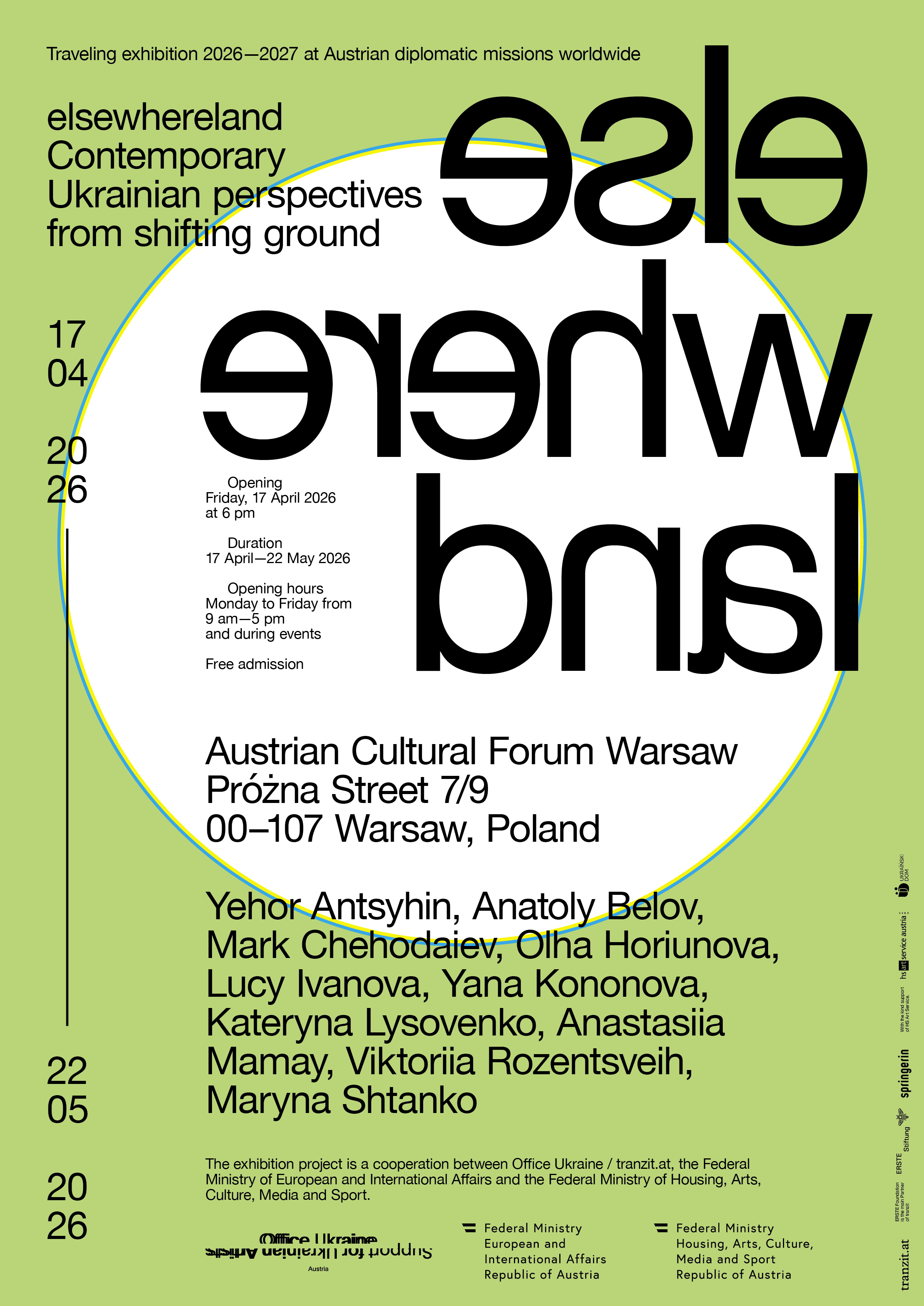 Wystawa objazdowa elsewhereland prezentuje prace współczesnych artystów i artystek z Ukrainy, ukazujące doświadczenia przesiedleń, strat i przetrwania. Zrealizowana we współpracy Office Ukraine / tranzit.at, Federalnym Ministerstwem Spraw Europejskich i Międzynarodowych (BMEIA) oraz Federalnym Ministerstwem ds. Mieszkalnictwa, Sztuki, Kultury, Mediów i Sportu (BMWKMS), wystawa podróżuje od stycznia 2026 do końca 2027 roku, odwiedzając dziesięć Austriackich Forum Kultury i misji dyplomatycznych na całym świecie.