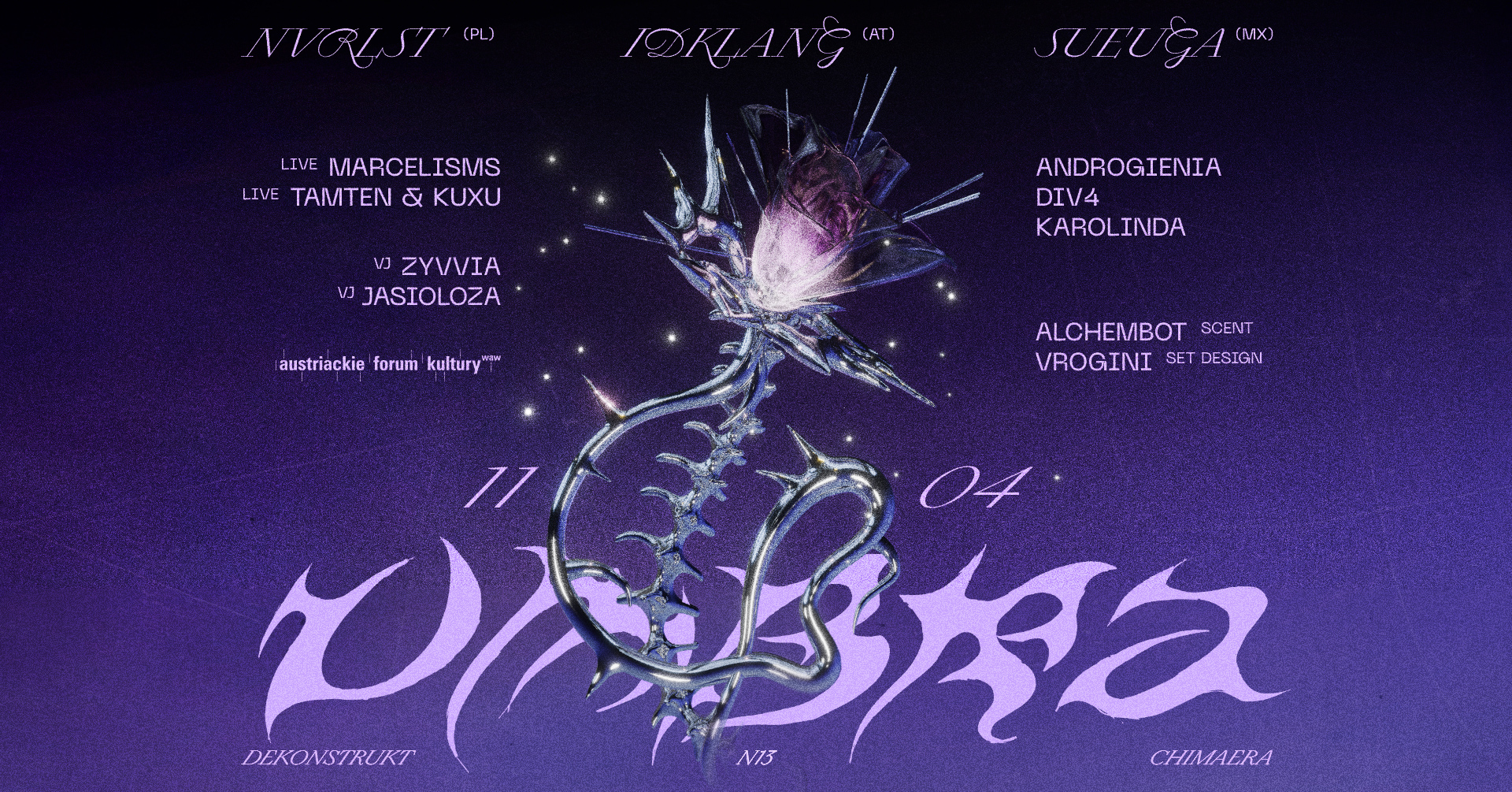 W ramach wydarzenia UMBRA, współtworzonego przez kolektywy Chimæra, DEKONSTRUKT i N13, IDKLANG wystąpi jako główna postać wieczoru, w dialogu z międzynarodowym line-upem obejmującym DJ-sety, live acty i działania performatywne.